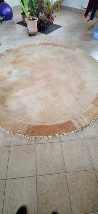Prodajam rabljen volnen tepih okrogle oblike v nežnih bež odtenkih. Tepih je še vedno v dobrem stanju in bi bil odličen dodatek vašemu domu. Resasti robovi dodajajo pridih elegance in topline prostoru, velikost 240cm