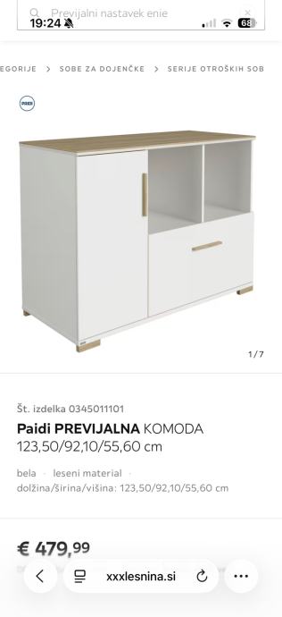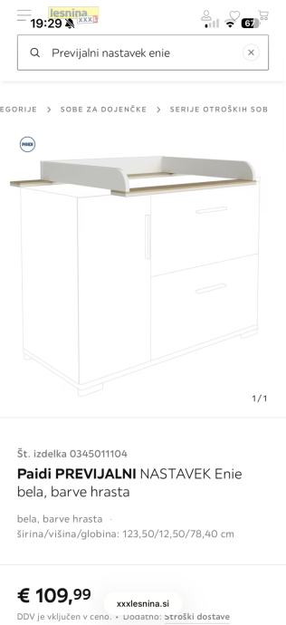 Prodam novo, še original zapakirano, previjalno komodo paidi in previjalni nastavek kupljeno v Lesnini letos marca. Slik razstavljene komode oziroma nastavka nimam, ker paketa nismo niti odprli, da bi komodo in nastavek sestavili, saj nam dimenzijsko ne ustreza, zato prilagam slike posnetkov zaslona z original spletne trgovine.