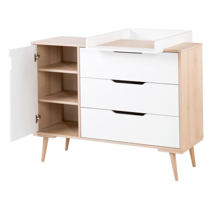 kombinaciji bele in natur barve (bukov in borov les s kombinacijo eko MDF plošč). Komoda ima tri prostorni predale ter omarico z dvema poličkama.
