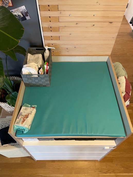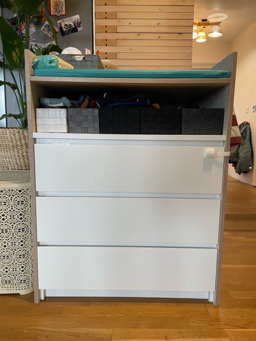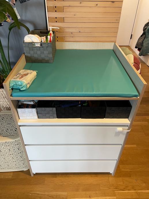 Prodam po meri narejeno previjalno mizo na Ikeinem predalniku Malm (vključen zraven). Zraven dam še po meri narejeno podlogo iz umetnega usnja in sivo škatlo za shranjevanje plenic (na sliki na previjalni mizi). Miza ima tud montiran praktičen roč za obešanje raznih oblačil. Ter varnostni zapah na prvem predalu. Škatle, ki so pod previjalno mizo, niso zraven v kompletu.