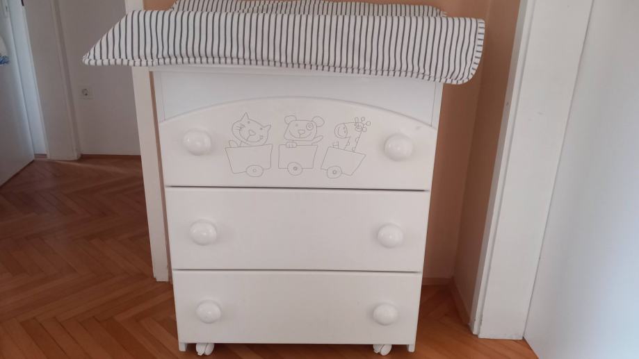 Bela, previjalna mizica s podlogo, tremi predali in banjico.