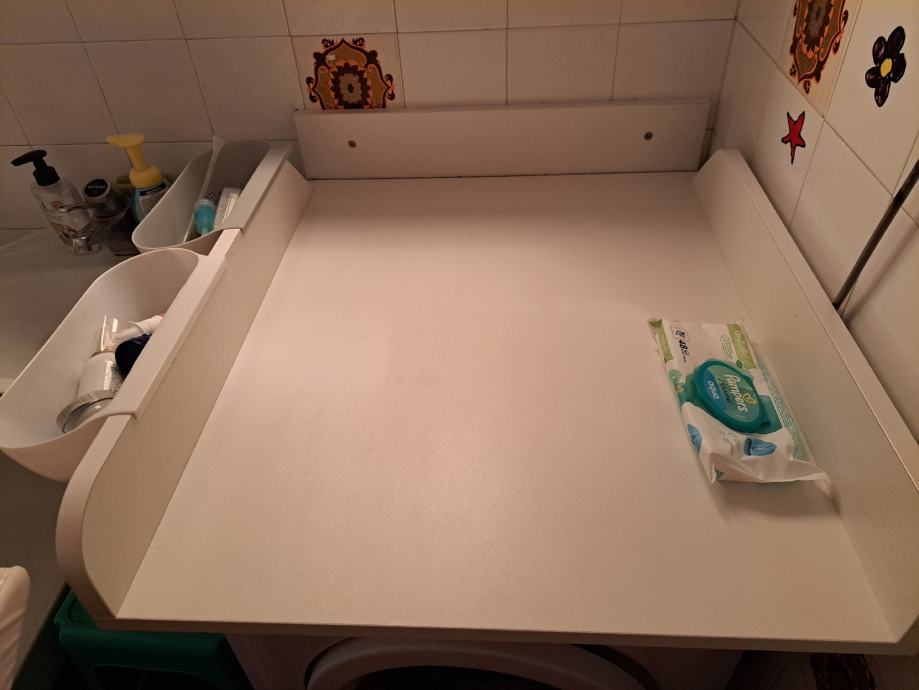 Prodam po naročilu narejeno leseno previjalno mizo, ki se jo lahko montira nad pralni stroj ali omarico. Lahko se tudi dvigne za lažji dostop do stroja ali omare. Brez poškodb.