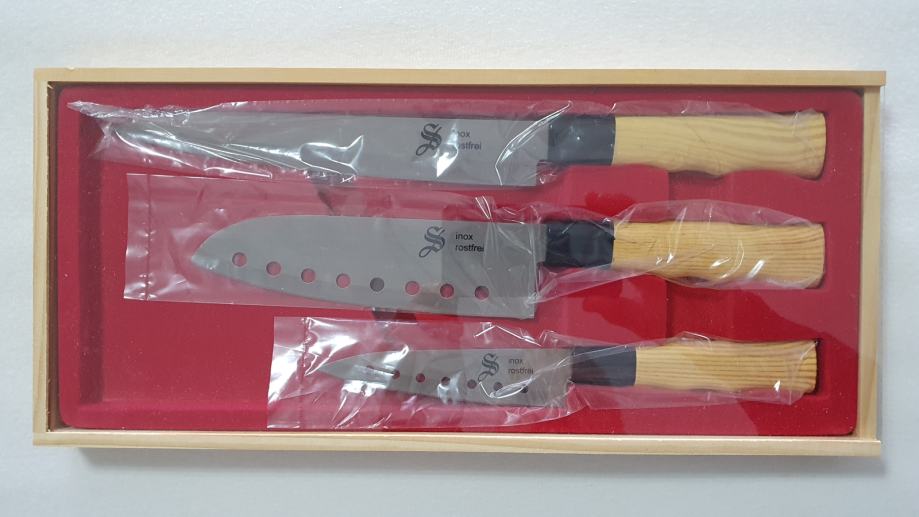 Prodam komplet 3 japonskih kuhinjskih nožev v originalni embalaži. Noži so v posebni leseni škatli pokriti s prozornim PVC pokrovom, primerno za darilo. Imam 25 kompletov, ki so mi ostali po zaprtju dejavnosti. Zainteresirani za vse, pokličite za dogovor.
