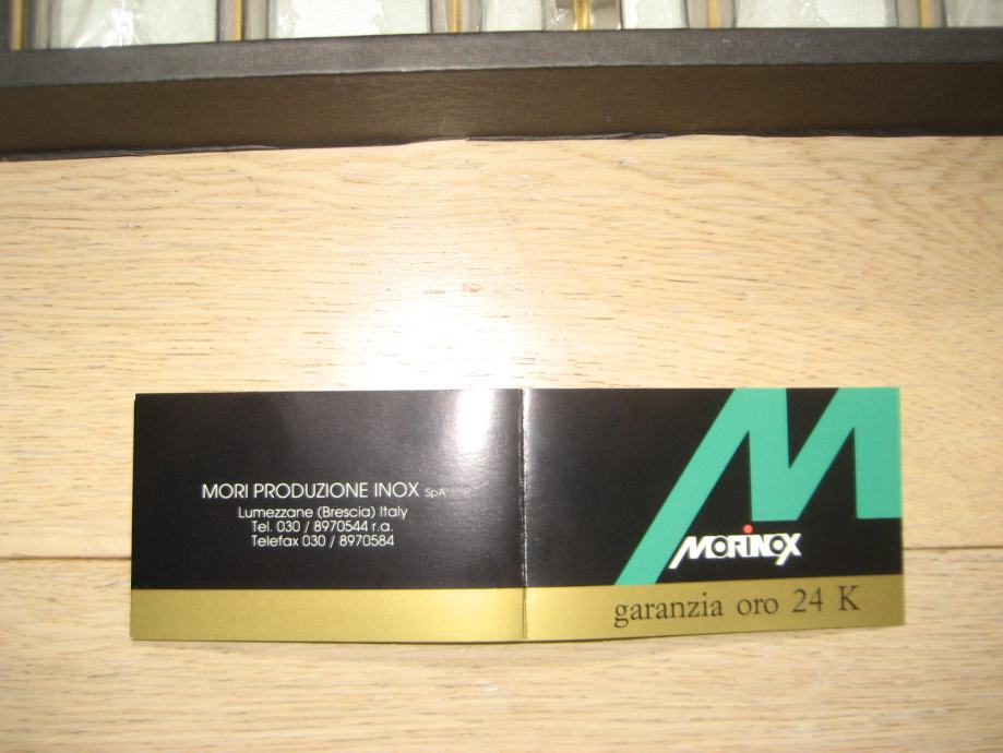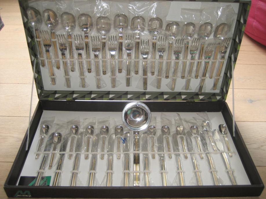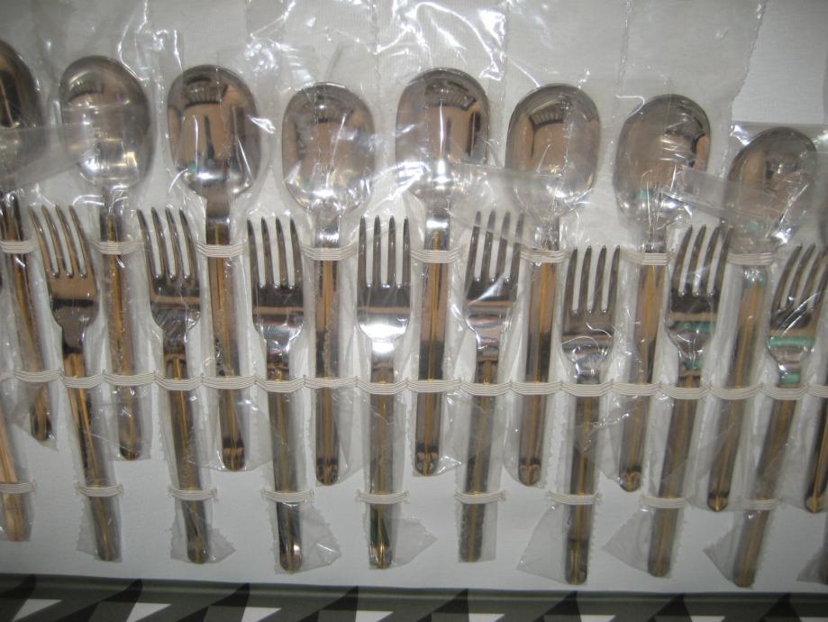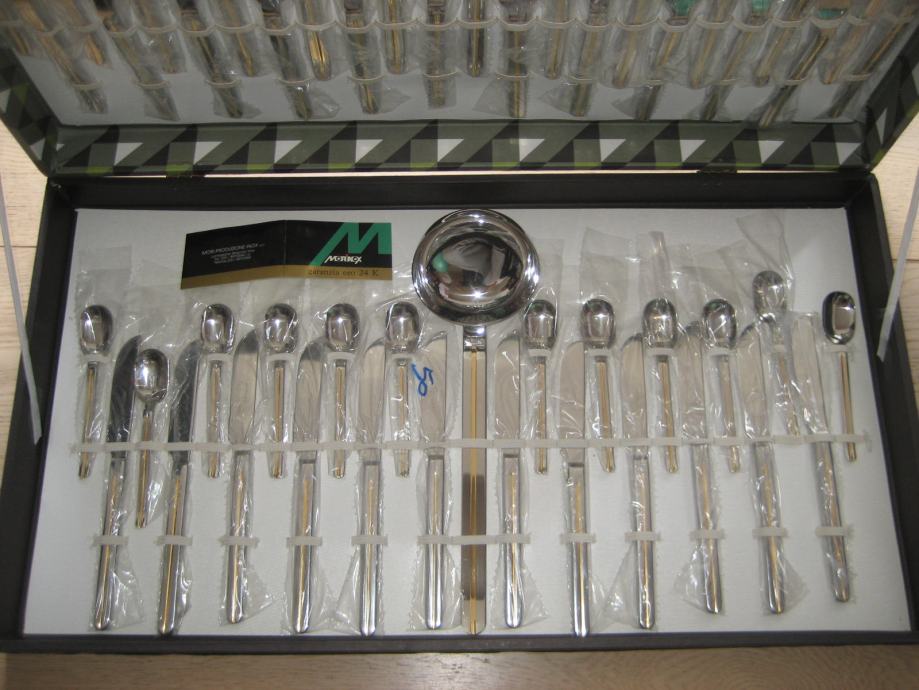 PRIBOR JE INOX Z DODATKOM 24 KARATNEGA ZLATA, KAR JE VIDNO NA ETIKETI IN SAMEM PRIBORU. ZAPAKIRAN V ORIGINALNI EMBALAŽI. PRIMEREN TUDI KOT DARILO.