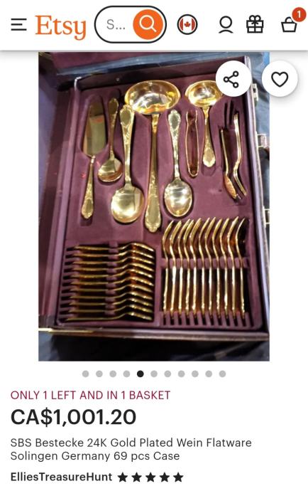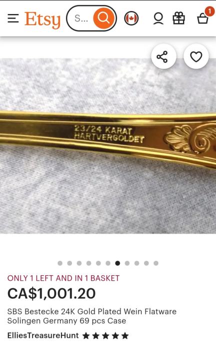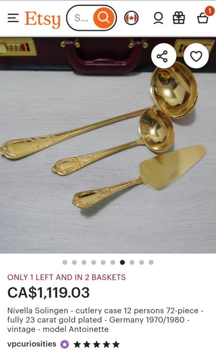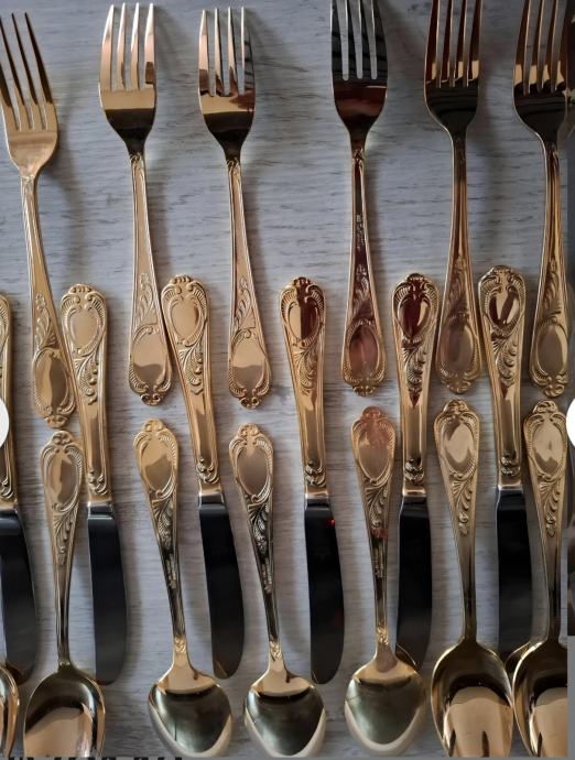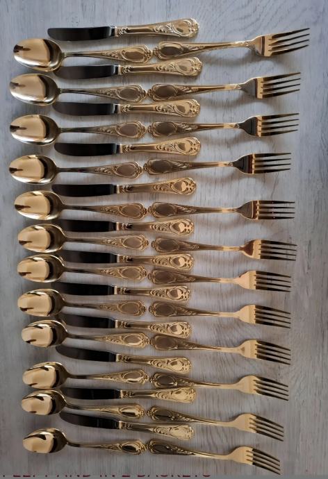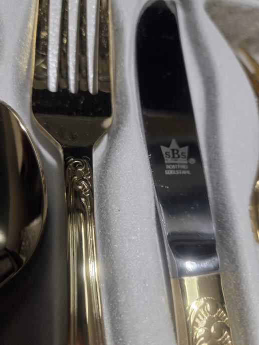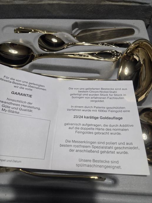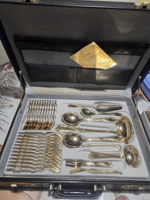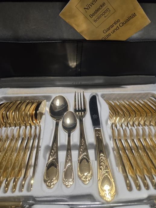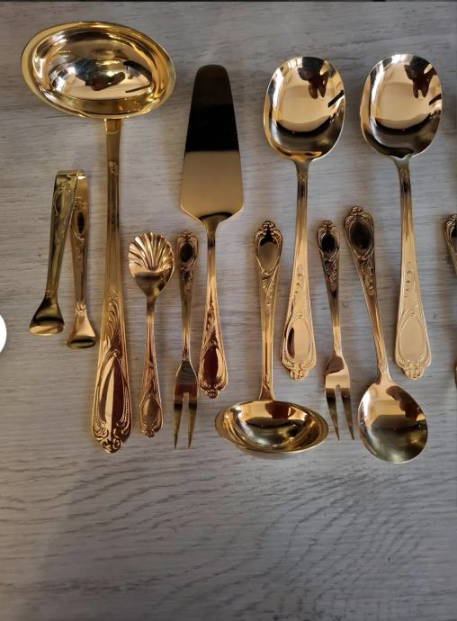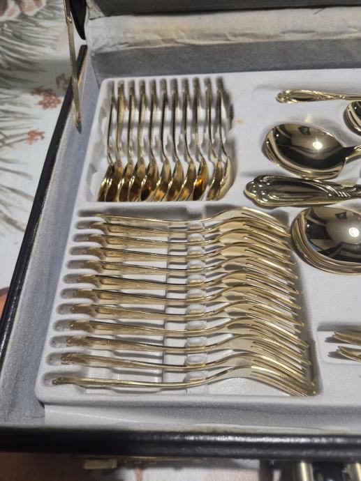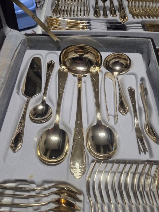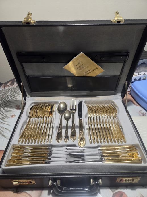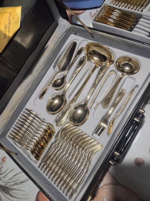 Prodajam rabljen komplet jedilnega pribora SOLINGEN SBS v elegantnem kovčku za 12 oseb.Pozlačen je z 24 karatnim zlatom. Pribor je lepo ohranjen kot nov in vključuje več različnih žlic, vilic in nožev z dekorativnimi ročaji. Kovček ima priložen originalni certifikat kakovosti in je idealen za posebne priložnosti ali kot dragocen dodatek vaši jedilnici.