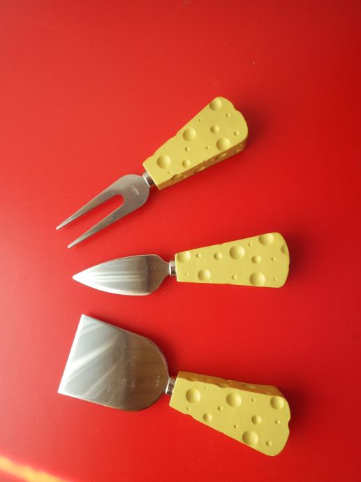 Set nožev za sir Segaform, vilice za serviranje, širši nož je primeren za trde sire (parmezan) kot tudi za mehkejše, ožji nož za srednje mehke sire (brie) in za mazanje sira na kruh.