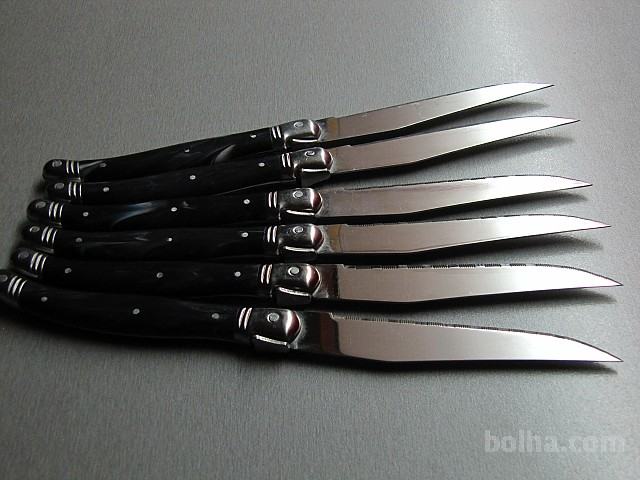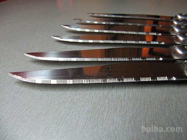 Prodam šest novih, nikoli rabljenih nožev z delno nazobčanim rezilom za enostavno rezanje (zrezek, pizza).
