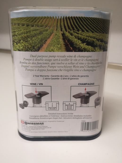 Vakumska pumpa švicarske znamke Swissmar omogoča, da odprto buteljko ohranite od 2 do 8 dni, odvisno od vrste vina.