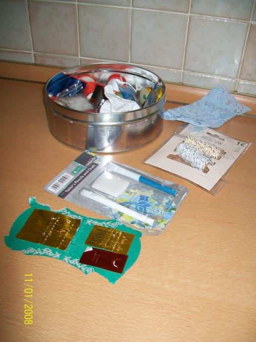 Pribor za šivanje je zelo bogat, tako da ga toplo priporočam. Kot je razvidno iz priloženih slik, je v temu kompletu tudi svinčnik za krojenje ter nekaj novih klobkov volne in pa tudi cvirna.