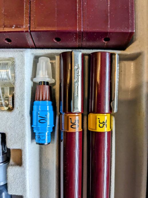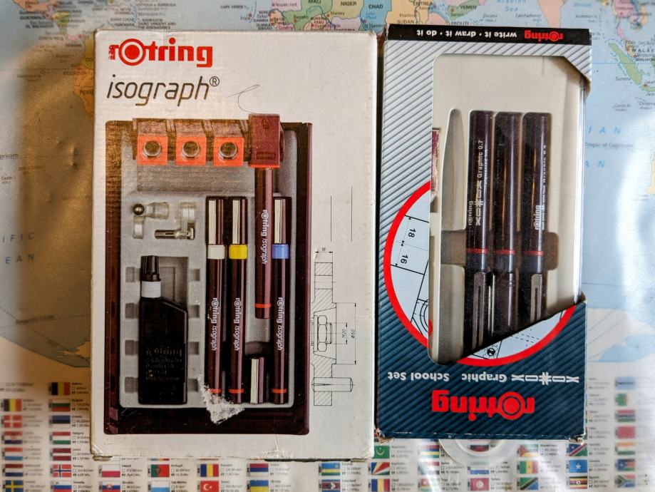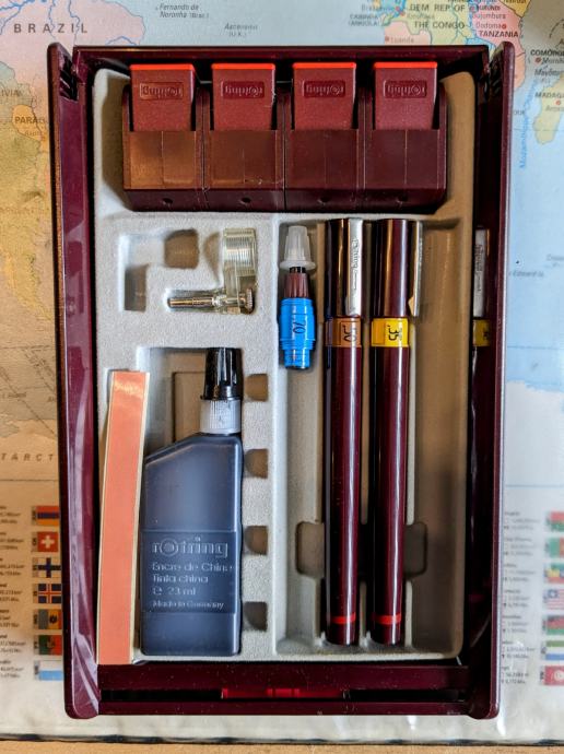 Prodajam set z dvemi pisali za tehnično risanje Rotring 0.35 mm in 0.50 mm. zraven dodam črnilo, nastavek za šestilo, držala za risanje škatlo ter komplet treh pisal rotring.