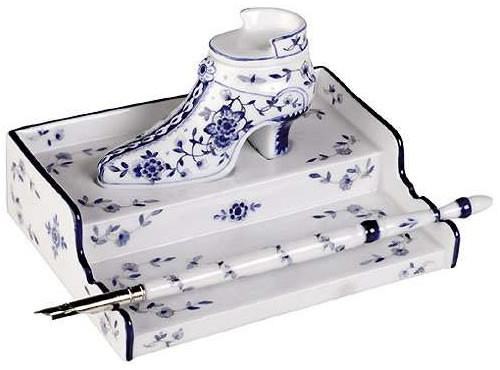 Meissen inkwell set za kaligrafijo vsebuje porcelanast podstavek ter dve porcelanasti posodici s pokrovčki, ki služita kot črnilnik in sta narejeni po zgledu originalnih okrasnih predmetov iz 19. stoletja. Porcelanast podstavek in posodici so ročno poslikani z majhnimi modrimi cvetovi. V setu dobite tudi elegantno stekleno pisalo.