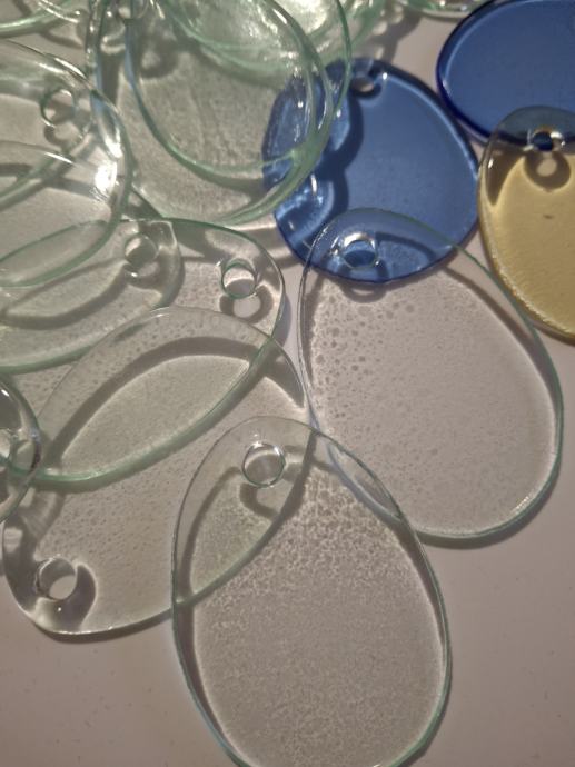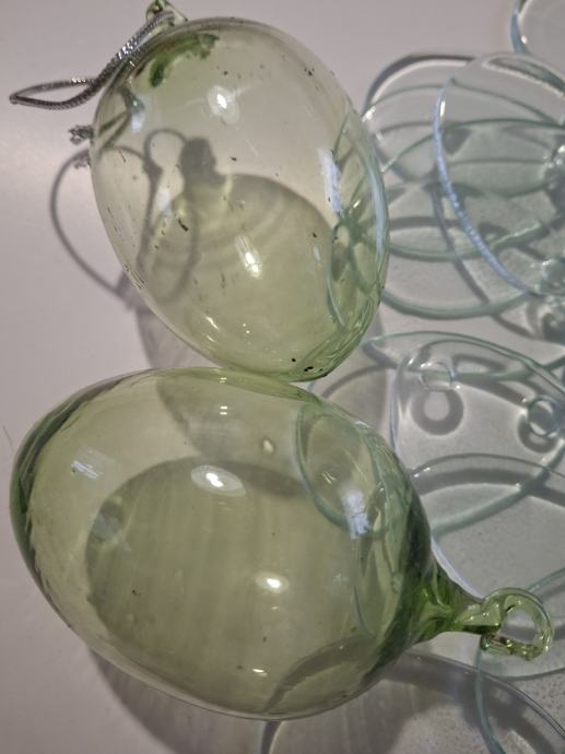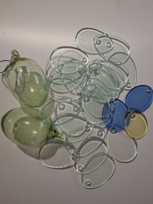 Zaradi opustitve ustvarjanja prodam steklena jajčka ko so vidna na sliki, 2 kot oblika in velikost kokošjega jajca z rinčico za obešanje ter 25 steklenih ploščic velikosti 6x4 cm, prav tako z luknjico za obešanje. Najraje osebni prevzem, lahko pa pošljem z navadno pošto s povračilom poštnine.