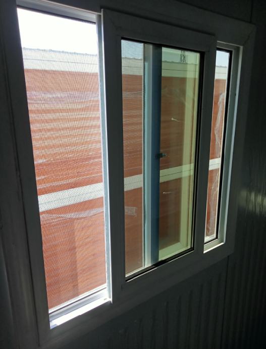 - z vhodnimi vrati na daljši stranici in dvemi okni s komarniki