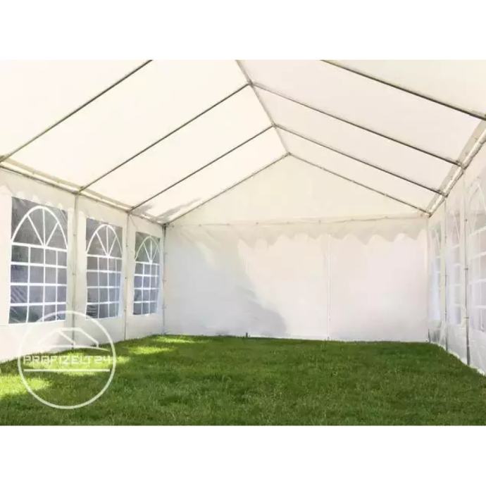 Ta šotor ima enostavno sestavljiv okvir iz popolnoma pocinkanega jekla brez korozije in več kot približno 700 g / m² 20 težkih ponjav iz PVC z robustno notranjo tkanino. PVC ponjave ponujajo visok faktor zaščite pred soncem 80+, so izjemno trpežne, vremensko odporne in 100% nepremočljive. Stranske dele lahko pritrdite posamezno na razdalji 2 m in tako omogočite številne izvedbene izvedbe.