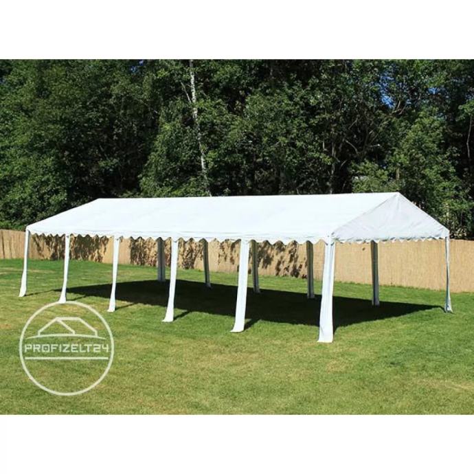 Ta šotor ima okvir, ki ga je mogoče enostavno sestaviti iz popolnoma pocinkanega jekla, odpornega proti koroziji in ognjevarno, približno 700 g / m² 20 težkih ponjav iz PVC z robustno notranjo tkanino. PVC ponjave nudijo visok faktor zaščite pred soncem 80+, so izjemno trpežne, vremensko odporne in 100% nepremočljive. Stranske dele lahko pritrdite posamezno na razdalji 2 m in tako omogočite številne izvedbene izvedbe.