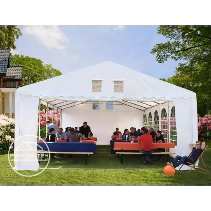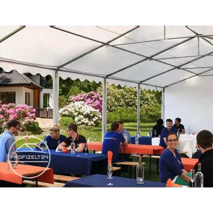 S stransko višino približno 2,6 m ta šotor za zabave ponuja veliko prostora na vrhu. Ima izjemno robustno, sorazmerno debelejšo povezavo, opremljeno s talnim okvirjem in dodatnimi strešnimi ojačitvami. Ognjevarne, certificirane, približno 1400 g/m² 20 težke PVC ponjave so izjemno vzdržljive, odporne na vremenske vplive in 100 % vodoodporne. Ponjava ima mrežasto notranjo tkanino, odporno na trganje, in visok faktor zaščite pred soncem 80+. Stranske dele je možno pritrditi posamično na razdalji 2 m in tako omogočiti veliko variant montaže. Ta posebej robusten in zelo stabilen šotor za zabave je idealen za celoletno uporabo. Za ta šotor nudimo 10-letno garancijo na dobavo rezervnih delov od datuma nakupa.