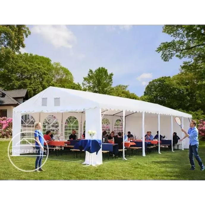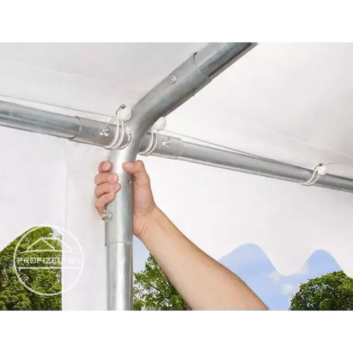 S stransko višino približno 2,6 m ta šotor za zabave ponuja veliko prostora na vrhu. Ima izjemno robustno, sorazmerno debelejšo povezavo, opremljeno s talnim okvirjem in dodatnimi strešnimi ojačitvami. Ognjevarne, certificirane, približno 1400 g/m² 20 težke PVC ponjave so izjemno vzdržljive, odporne na vremenske vplive in 100 % vodoodporne. Ponjava ima mrežasto notranjo tkanino, odporno na trganje, in visok faktor zaščite pred soncem 80+. Stranske dele je možno pritrditi posamično na razdalji 2 m in tako omogočiti veliko variant montaže. Ta posebej robusten in zelo stabilen šotor za zabave je idealen za celoletno uporabo. Za ta šotor nudimo 10-letno garancijo na dobavo rezervnih delov od datuma nakupa.
