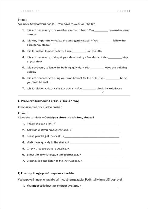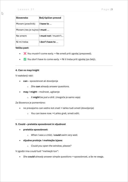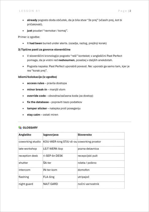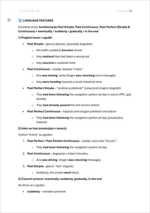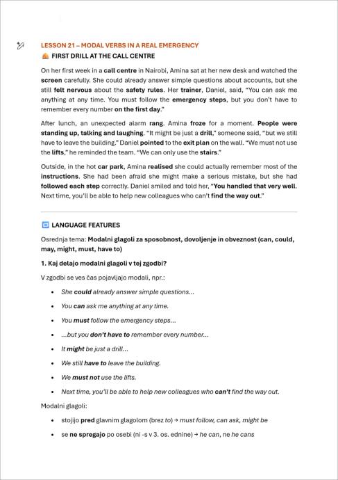 * zgodbo (EN) + razlago ključne slovnice (vse razlage so v slovenščini)
