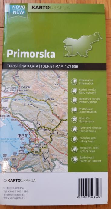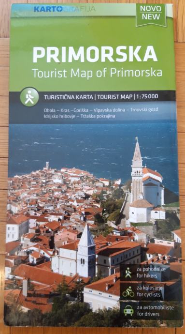 Prodam Turistično karto Primorska: Obala, Kras, Goriška, Vipavska dolina, Trnovski gozd, Idrijsko hribovje, Tržaška pokrajina, merilo 1: 75 000.