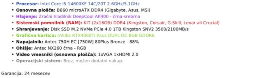 • Grafična kartica: nVidia RTX 4060 Ti 8GB (Dual OC)