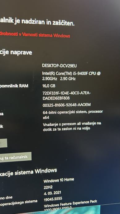 •procesor: Intel(R) core(TM) i5-9400F CPU