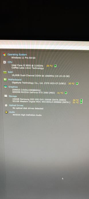 Prodam računalnik z i5 9500 procesorjem hlajen z novim Deepcool hladilnikom, 16ram Ddr4 spomina 2x8g Rip.Jaws 3200mhz, Matična plošča Gigabayte Z370 HD3, Grafika MSI Ventus OC RTX 2060 12giga vram, Hramba SSD Samsung Evo 850 250g in 1Tb HDD Wd, Napajalnik NOV Cougar Atlas 650w 80+ Bronz, Ohišje LC Sera X Gaming 5x ventilator Rgb za boljše zračenje. Na novo naloženi Win11 pro pripravljen za uporabo. Možen dokup monitorja in ostale opreme za kompleten sestav. Lp