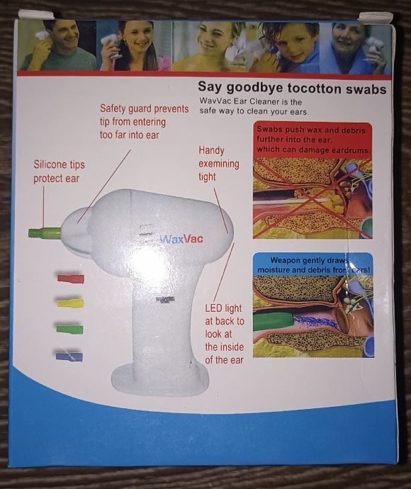 Zavrzite vatirane palčke in si raje očistite ušesa s pametnim čistilcem ušes. Čistilo absorbira vosek in druge nečistoče. Priložene štiri zamenljive šobe.