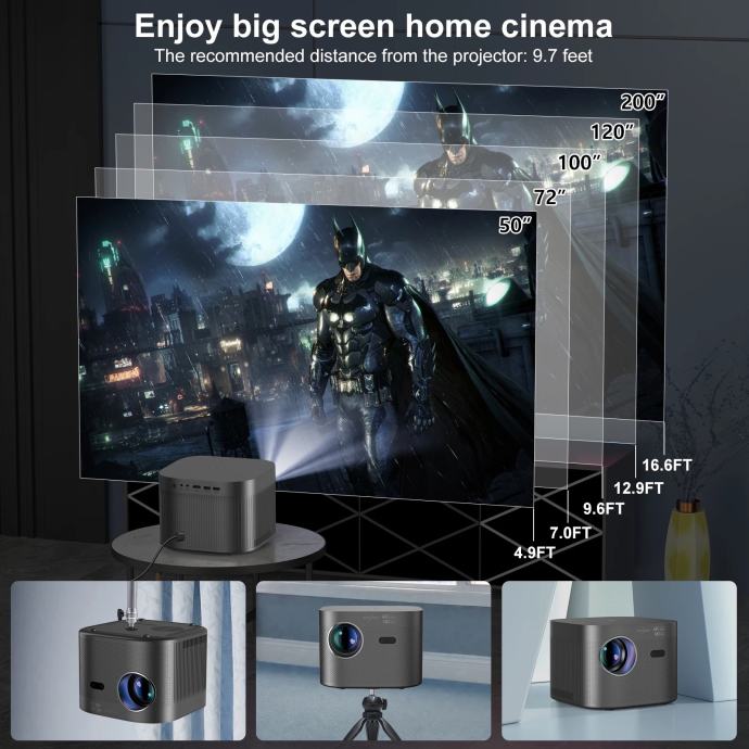 Mini SMART projektor omogoča 180-stopinjsko rotacijo, tako da lahko sliko postavite kamorkoli želite - na steno, strop ali tla. Prilagodite velikost slike od 50% do 100% brez težav s pomočjo daljinskega upravljalnika (posebna ZOOM funkcija, ki je velika večina konkurenčnih projektorjev v temu cenovnem rangu NE podpira).