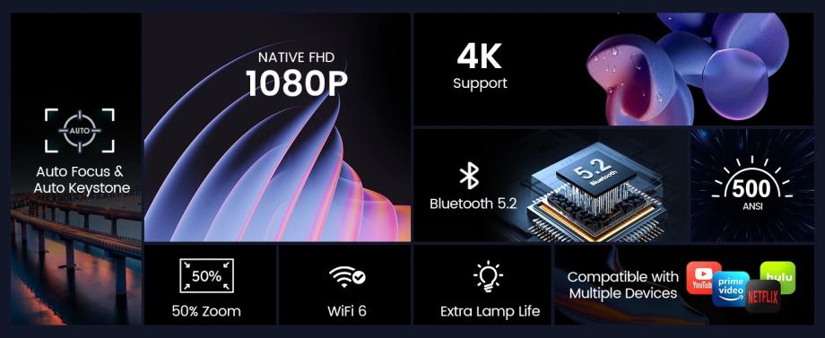 S hitro 5G in 2.4G Wi-Fi povezljivostjo ter Bluetooth 5.0 vam ta projektor omogoča brezhibno povezovanje z različnimi napravami. Pozabite na zapleteno žično povezavo in se potopite v svet brezmejne, brez kabelske zabave.