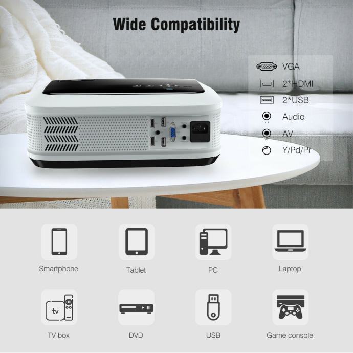 LED žarnica s svetlostjo kar 4000 lumnov je kot nalašč za prijetne dneve v udobju lastnega doma, saj je dovolj zmogljiva, da za ogled ne potrebujete popolne teme. Projektor ima ogromno možnosti povezave, tako žične, kot tudi POVSEM BREZŽIČNE POVEZAVE. Povežite ga lahko s telefonom, prenosnikom, računalnikom ali televizorjem preko WIFI povezave in izhodov AV, VGA in HDMI. Zraven dobite tudi brezplačni kabel HDMI in priključek za povezavo z zvočniki. Prav tako lahko vanj vstavite kartico SD ali USB ključek.