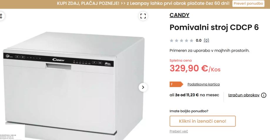 Prodam nikoli uporabljen pultni pomivalni stroj Candy CDCP6.