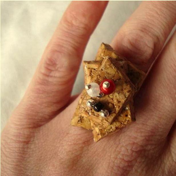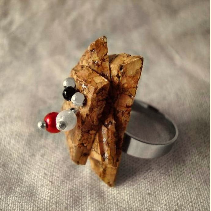 Kovinski prstan nickel free z okrasnimi iz plute, zaščitene pred vlago oz.vodo. Unikat. Nenošen.