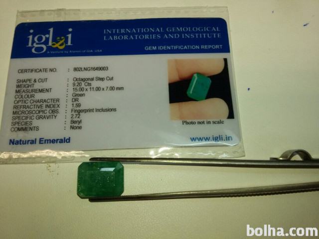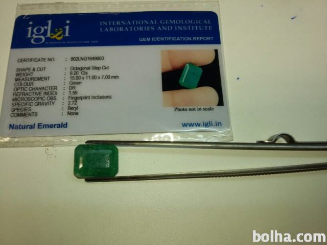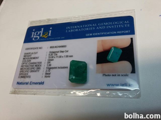 Prodam Smaragd s priloženim certifikatom o avtentičnosti kamna.Smaragd je pravokotne oblike s sledečimi dimenzijami 15×11×7mm in teže 9,20ct