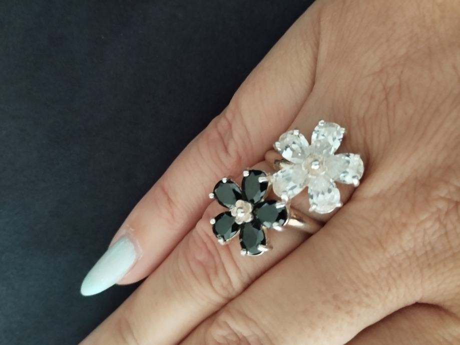 Prstan je iz srebra, z žigom. Swarovski beli in črni "kamni", brezhibno ohranjen, krasno se sveti.