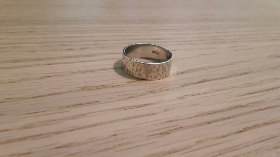 Prodam srebrn prstan, širina 6mm, premer 18mm. Površina je obdelana tako, da izpade kot kraterčki na lunini površini, kar izgleda zelo lepo. Vdolbine kraterčkov so rahlo potemnele, kar prstan naredi še bolj zanimiv in izpade v živo lepše kot na sliki, lahko pa se potemnelost tudi očisti. Prstan je v brezhibnem stanju. Danes take prstane prodajajo kot poročne po 130 € za en prstan.
