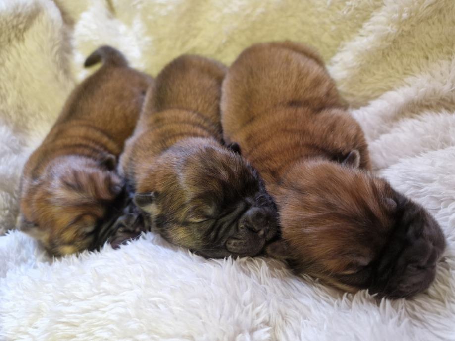 Mladički so ob rojstvu prejeli imunostimulacijo, ki jo bodo ponovno prejeli in bodo po naročilu očiščeni parazitov ter vzgojeni z otroki in veliko ljubezni. Mama in oče mladičkov sta moja last, mama je krem, oče pa rdeč - zdrav in redno cepljen z vso potrebno dokumentacijo.