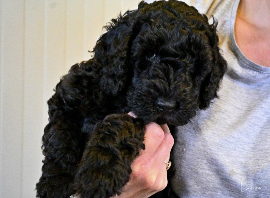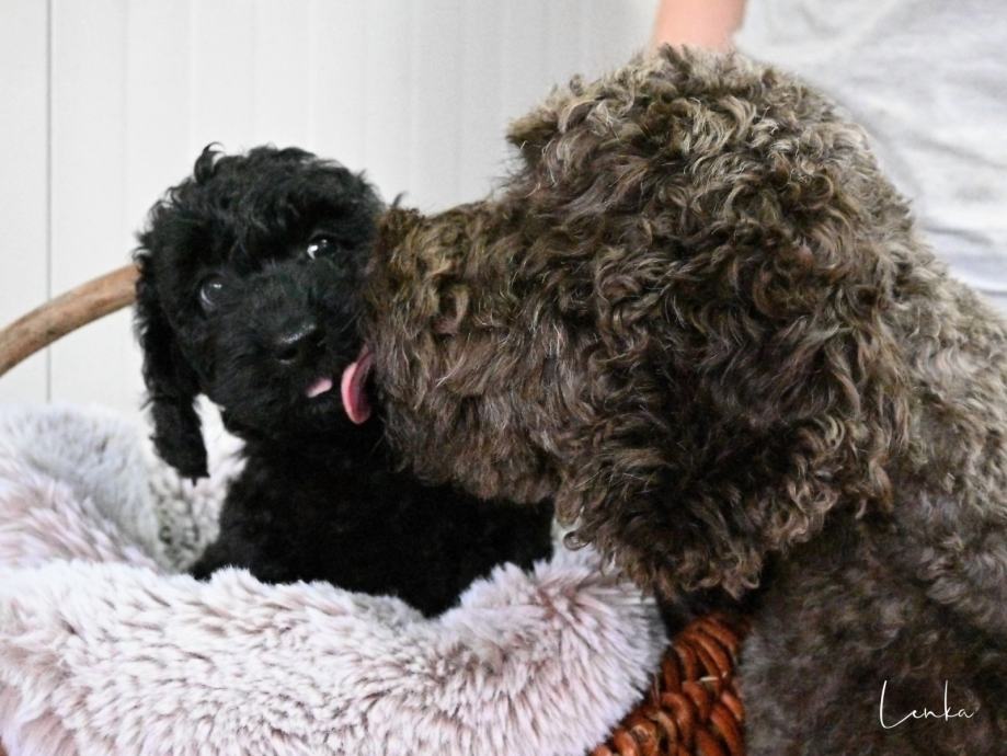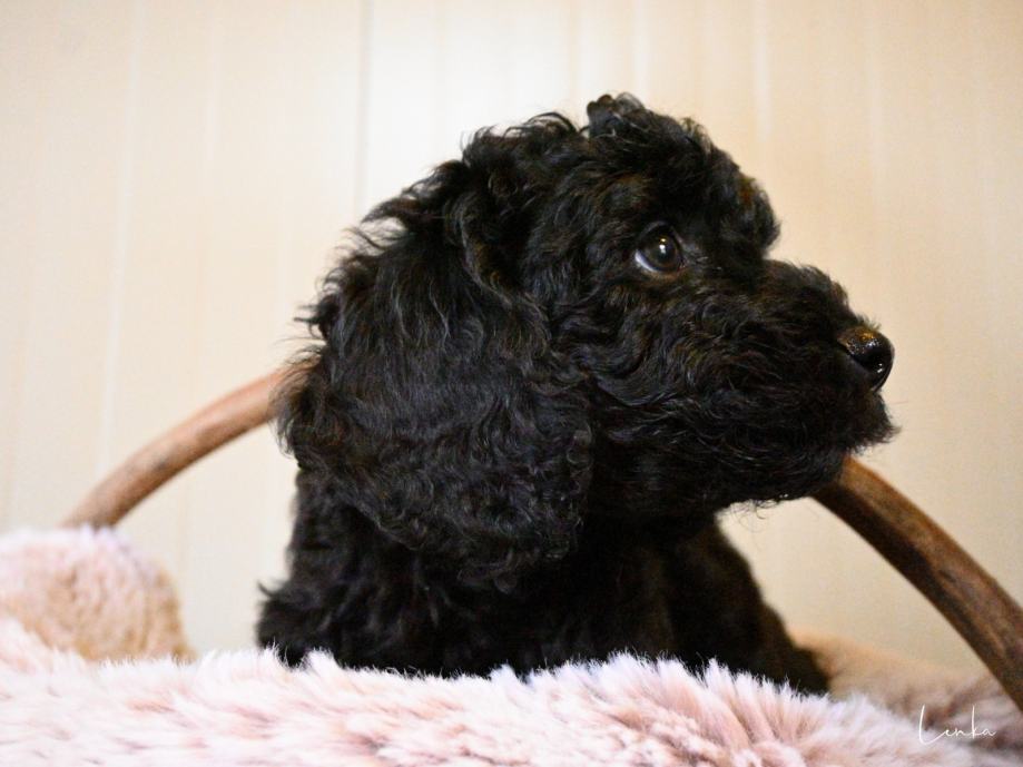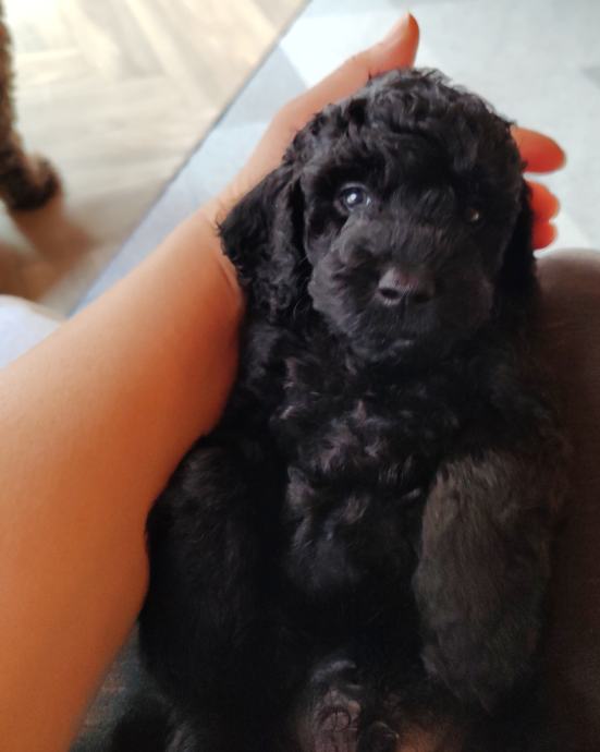 Konec septembra se nam je skotilo 6 zdravih cockapoo mladičkov. Na voljo le še fantek v črni barvi zaradi odpovedi rezervacije. Star je 3 mesece in primeren za prevzem takoj. Cockapoo je načrtno križanje dveh pasem, španjela in pudlja. Ni FCI priznana pasma nikjer v svetu , kar pomeni da ne more imeti FCI rodovnika. Imamo pa klubske rodovnike ,izdelane v Avstriji ter USA v posebnih zvezah, ki so za križane pasme. Torej genetika se vidi za nazaj, kar je zelo pomembno. Glede same vrste psov je ogromno napisanega na spletu, sicer pa veliko informacij dobite na spoznavnem srečanje pri nas. Kužki so zelo nežni, energični , radi delajo in niso psi za poležavanje. Se prilagodijo vašemu življenjskemu stilu zelo hitro. Seveda tudi obožujejo crkljanje z vami na postelji. So izredno inteligentni ter lepo delajo v šoli. Pasja šola je zelo priporočljiva, da si vzgojite takega kužka kot želite.Najpomembnejša je socializacija do 3,5 mesecev. Najraje oddamo ljudem, družinam ali posameznikom z hišo z ograjenim vrtom, jim pa je všeč tudi stanovanje v bloku. Se navadijo sobivanja z mucami, papigami ipd.. Primerni so za alergike, saj dlaka ne izpada ter nimajo nobenega vonja. Če imate alergije, priporočam, da veste, če je kdo alergičen na pasjo dlako, nekateri imajo alergije tudi na pudlja, sicer to so res redke izjeme. Mamica in očka sta oba doma pri nas. Mamica je čokoladne barve cockapoo F2, PRA clear ter očka je pudeljček bele barve, tudi narejen genetski test na PRA in je clear. Bodo velikosti med 7 do 13kg, nekje cca med 36 do 43cm plečne višine. Različnih barv so pa po prednikih, babica mladičkov tudi živi z nami. V nove domove lahko odidejo po 8.tednu starosti. Bodo predtem cepljeni, čipirani ter veterinarsko pregledani. Imeli bodo EU potni list. Vsi naši psi so vpisani v slo. register psov. Bodo redno razgliščeni, očiščeni notranjih zajedalcev. Če bi si želeli takega kužka, je najbolje, da me pokličete za vse informacije, ki jih z veseljem podelim z vami, v kolikor vas resno zanima nakup takega kužka. Kličite prosim le resni, hvala. INFO: 070 644 376, Simona