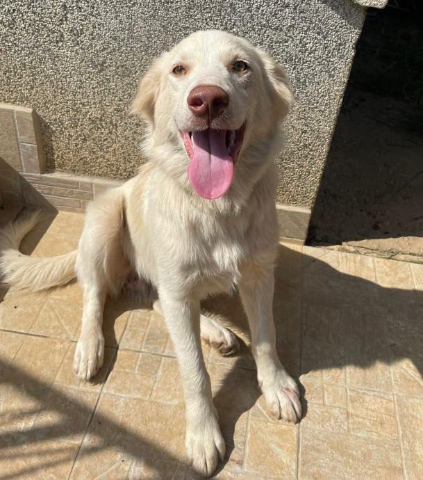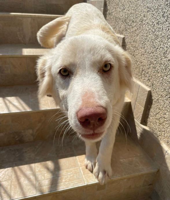 Ta ljubki albino smrček, mešanček ovčarja in prinašalca s pikčastim trebuščkom, išče svoj topel dom!