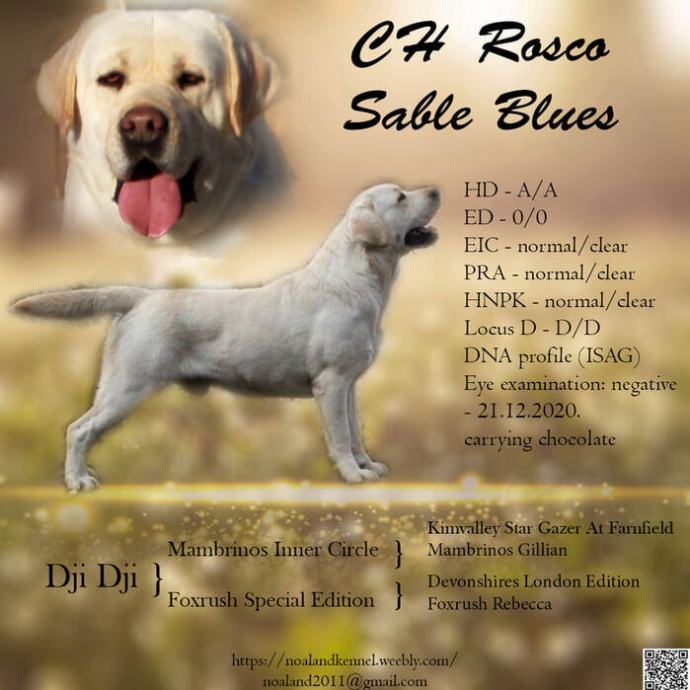 1. CH Rosco Sable Blues - samec rumene barve, hrvaški šampion v lepoti, izjemnega delovnega temperamenta, ima opravljeni mednarodni delovni test, in je že oče mnogih vrhunskih mladičkov, tako v naši psarni kot v Sloveniji. Uvežen je iz Češke, iz jedne od ponajboljih psarni, Sable Blues, angleških krvnih liniji. Njegova je majka uvežena iz Anglije, a oče iz Norveške.