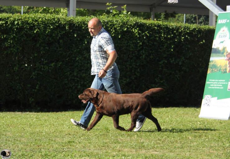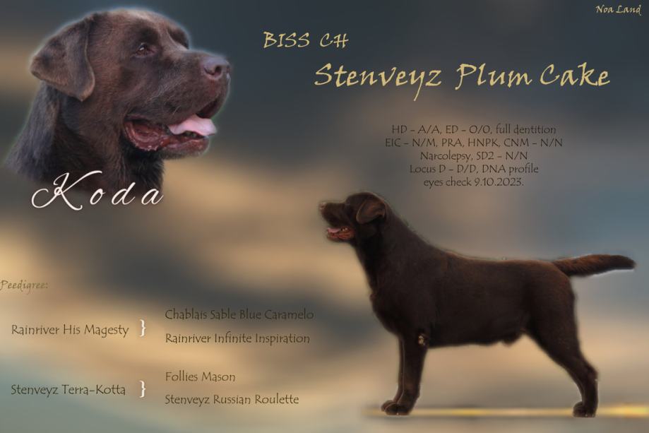 2. BISS CH Stenveyz Plum Cake - samec rjave barve, je uvežen iz Rusije, iz jedne od najstarješih psarni labradorcev, in je tipičnega dogoletno vzrejanoga labradorskega temperamenta. Izejemnio je uspešen rastavni pes, je prvak Hrvaške v lepoti i klupski prvak Hrvaške 2023. leta i je že oče mnogih vrhunskih mladičkov, tako v naši psarni kot v Sloveniji. Ima opravljeni mednarodni delovni test in naslednje genske i zdravstvene teste: