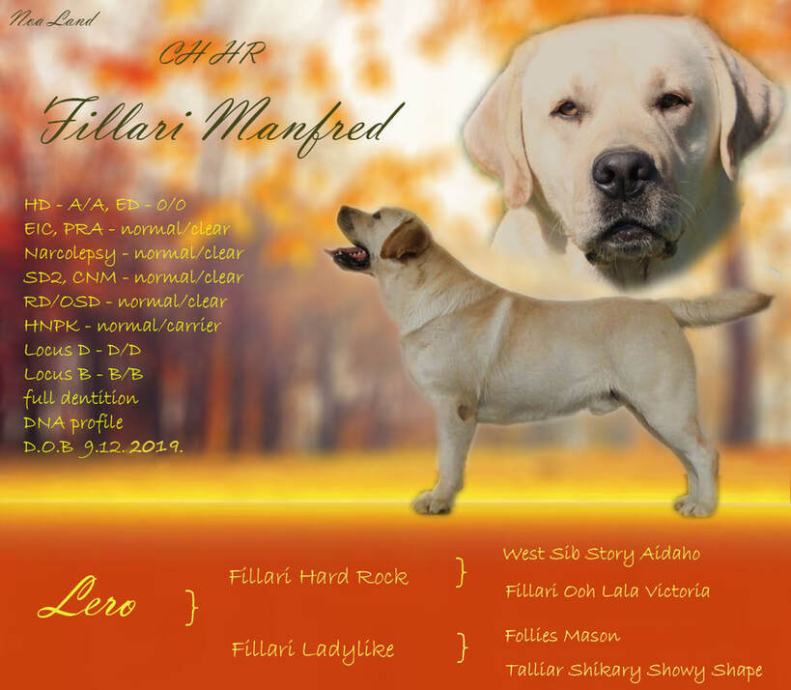 3. CH Fillari Manfred - je rumeni samec uvožen iz Rusije in je vnuk večkratnega svetovnega prvaka pasme. Oče je mnogih vrhunskih mladičkov, tako v naši psarni kot v Sloveniji, hrvaški je prvak v lepoti in ima opravljeni mednarodni delovni test.