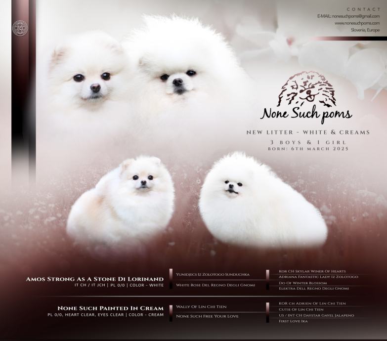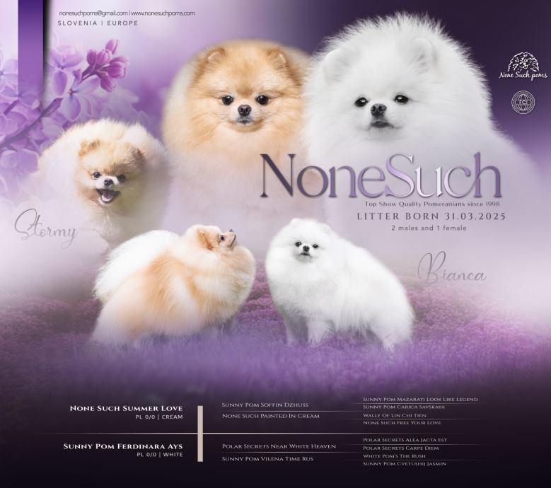 V uveljavljeni slovenski psarni "None Such" že skoraj 30 let vzrejamo pomerance vrhunske razstavne kvalitete, naši kužki odraščajo v družinskem krogu, so redno veterinarsko pregledani, vsi imajo uradna veterinarska zdravstvena potrdila (pregledane pogačice, srce, oči, kolki, komolci, ščitnica, celoten DNK profil za vse bolezni in barve,...), saj nam je pri vzreji najbolj pomembno, da so kužki iz naše vzreje zdravi in lahko živijo polno aktivno življenje. Poleg tega so naši kužki tudi izredno uspešni na razstavah, imamo večkratne prvake iz različnih držav. Redno se izobražujemo na področju vzreje, genetike, telesne zgradbe, zdravja, alternativnega zdravljenja, vzgoje,...