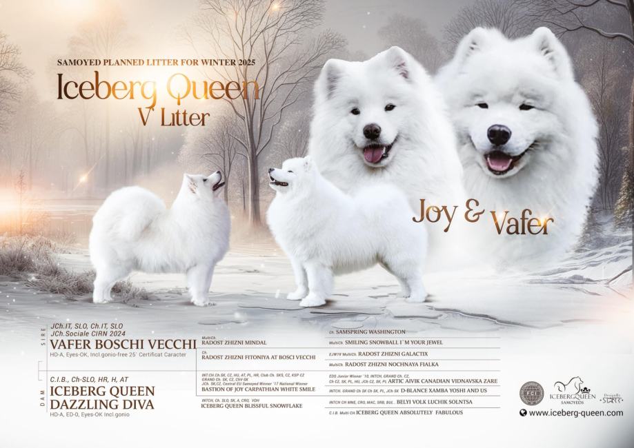 V psarni Iceberg Queen z veseljem naznanjamo, da so na voljo vrhunski mladički pasme Samojed (https://www.iceberg-queen.com/puppies_joy_vafer.html).
