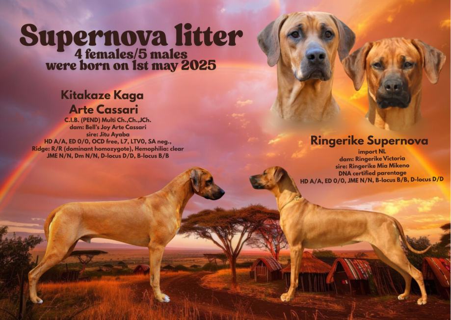 Prodajamo mladičke rodezijskega grebena šampionskega porekla. Mama mladičkov je Ringerike Supernova, psica uvožena iz znane psarne Ringerike iz Nizozemske. Kujica ima vse zdravstvene teste, ima DNK profil potrjen na Nizozemskem. Oče mladičkov je Multi Ch. Kitakaze Kaga Arte Cassari (SK), mladi svetovni podprvak, prav tako z vsemi zdravstvenimi testi. Mladički so se skotili po naravni poti 1. maja 2025, v leglu pa je 5 samcev in 4 samičke. Mladički so pripravljeni za prevzem od kraja julija. Ob prevzemu bodo mladički dvakrat cepljeni proti nalezljivim boleznim, očiščeni parazitov, z evropskim potnim listom, mikročipom in export rodovnikom HKS. Prosta ena samica.
