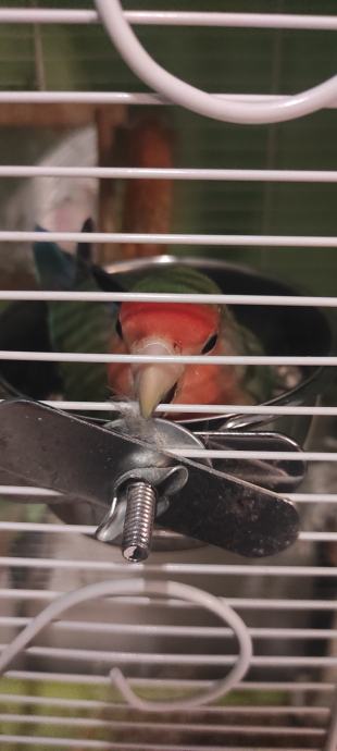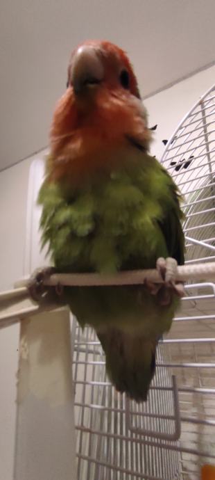 Majhen papagaj vrste agapornis. Ženskega spola, zelene barve.