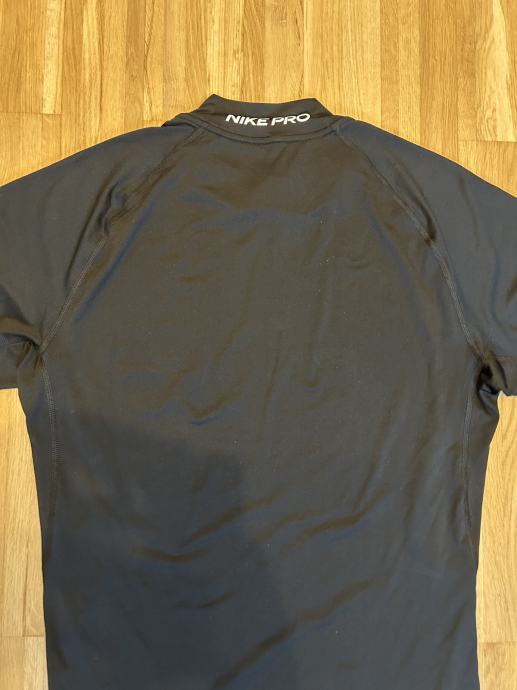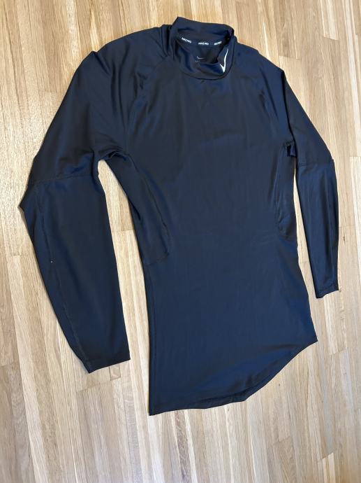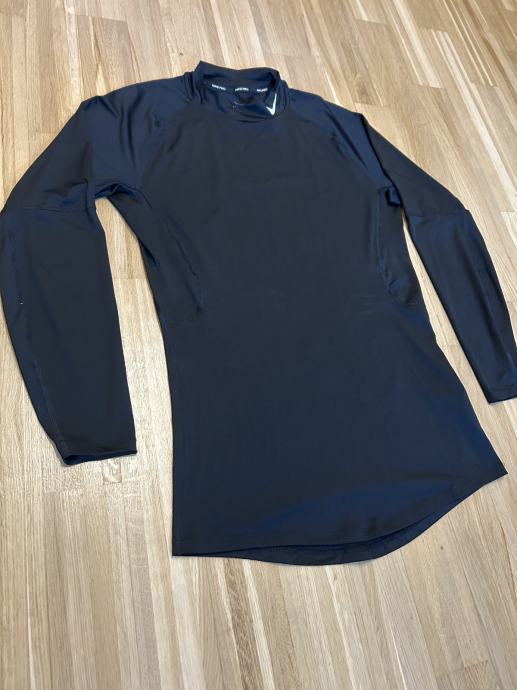 Črn moški športni pulover Nike Pro velikosti L z dolgimi rokavi, primeren za športne aktivnosti. Narejen je iz mešanice 90% poliestra in 10% elastana, ki zagotavlja udobje in prilagodljivost med gibanjem. Pulover je zasnovan v športnem kroju, ki se lepo prilega telesu.