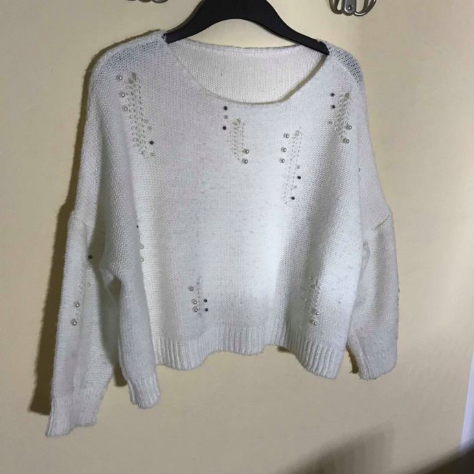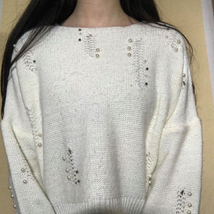 Pulover v beli barvi z raztrganim videzom in dodatkom perlic.