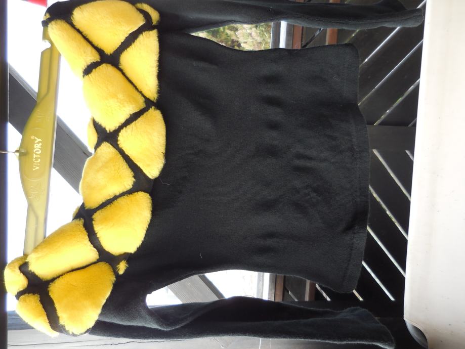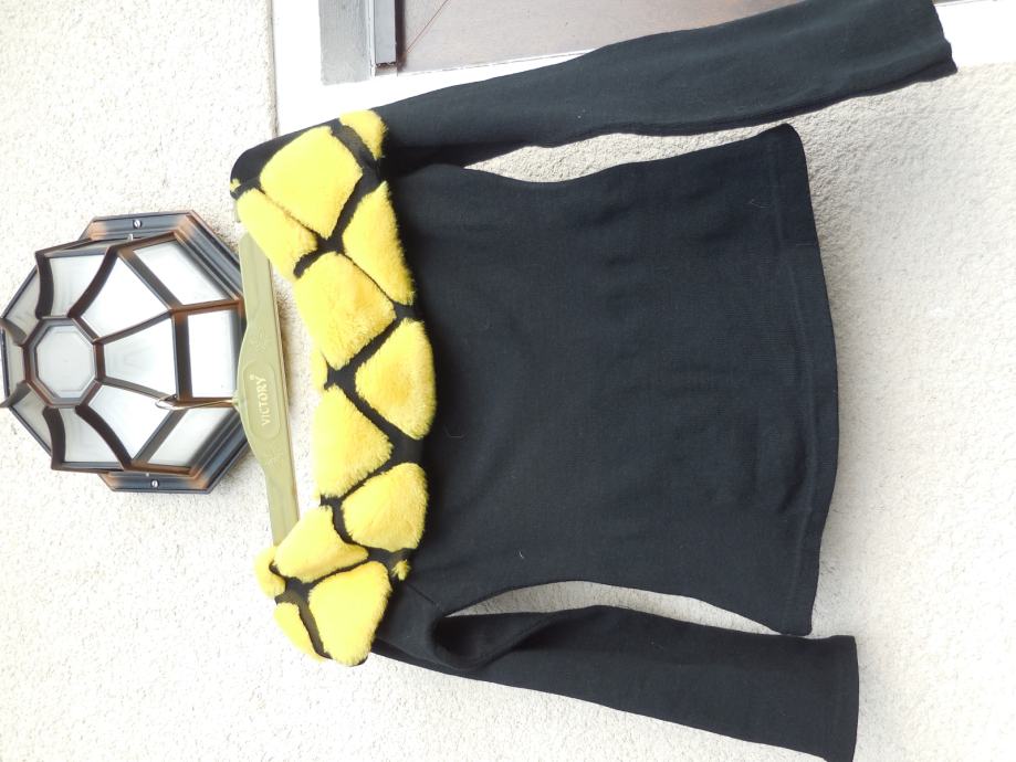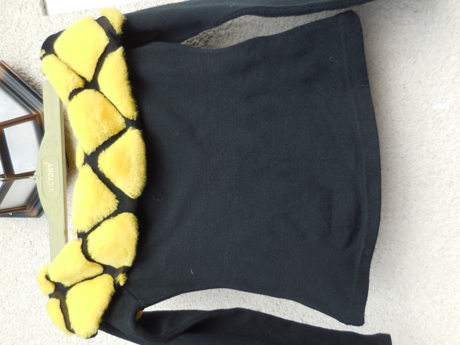 Zelo lepo ohranjen, skoraj nenošen kratek črn pulover z velikim ovratnikom, na katerem so iz umetnega krzna prišit karo liki in liki trikotnika v rumeni barvi. Pulover je raztegljiv.