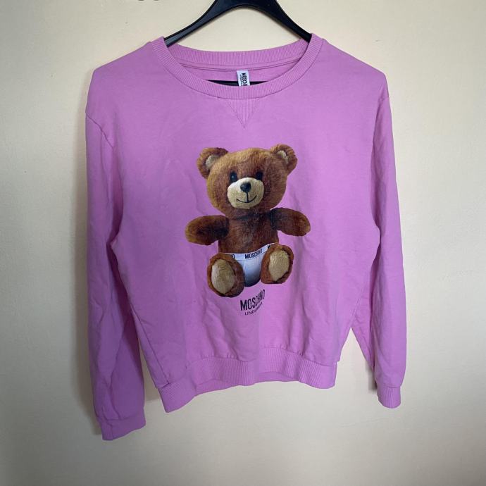 Prelep Moschino original pulover v roza barvi. Malo nošen, vendar se je med sušenjem v sušilcu žal uničil potisk (vidno na četrti sliki), zato ga prodam po nizki ceni.