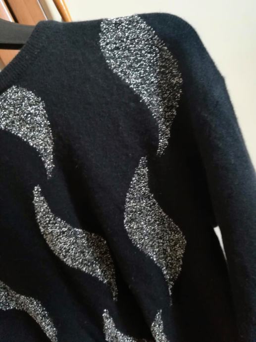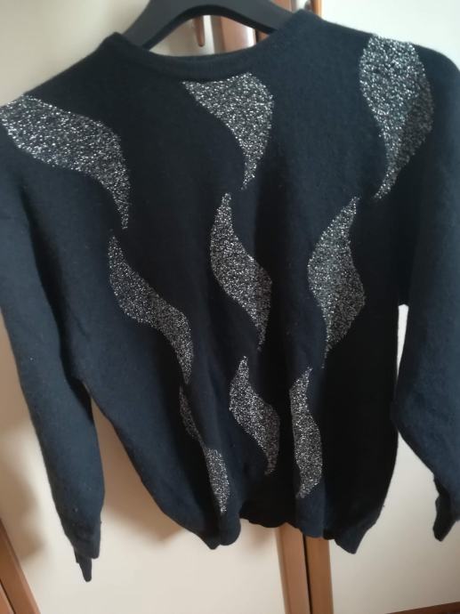 Lep in puhasto mehak pulover (angora), primeren od M-L številke, čne barve. Le malo nošen, le ob posebnih priložnostih, bleščeč srebrn vzorec spredaj.